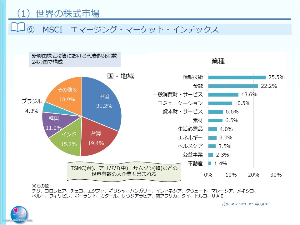 まずは、2025年10月末現在のMSCI エマージング・マーケット・インデックスの構成と業種分散を確認しましょう。