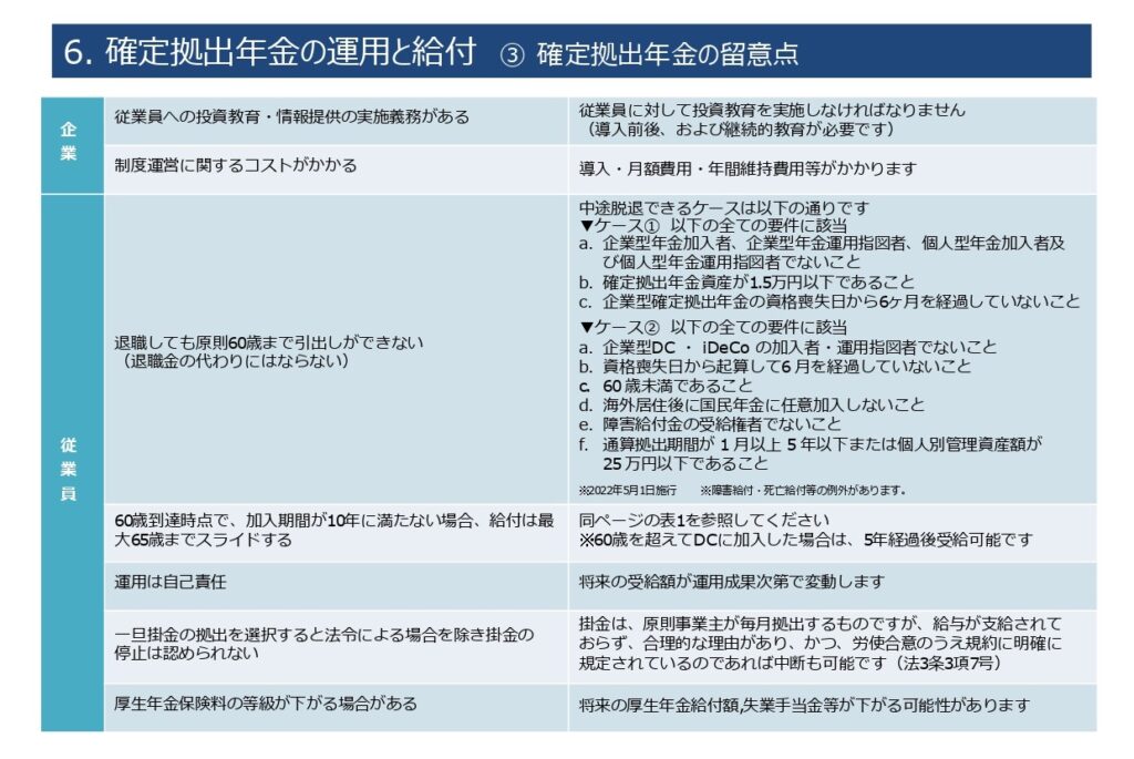 パンフレットの解説の二十一回目は、「6. 確定拠出年金の運用と給付 ③確定拠出年金の留意点」です。