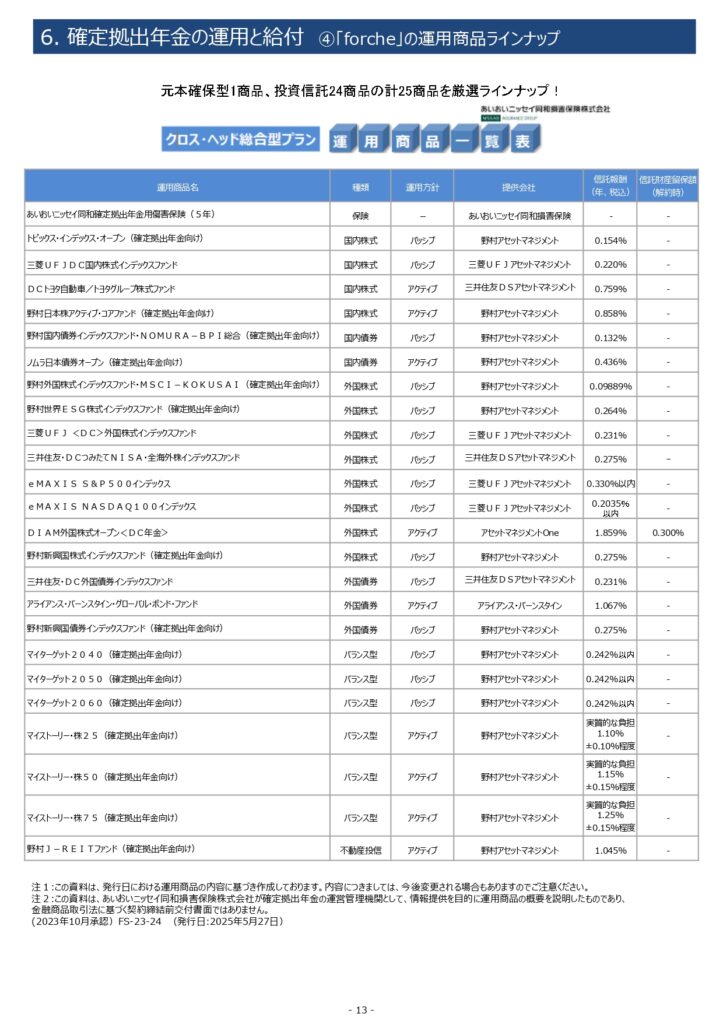 パンフレットの解説の二十二回目は、「6. 確定拠出年金の運用と給付 ④「forche」の運用商品ラインナップ」です。そして、今回が「企業型DCのパンフレットの解説」の最後となります。