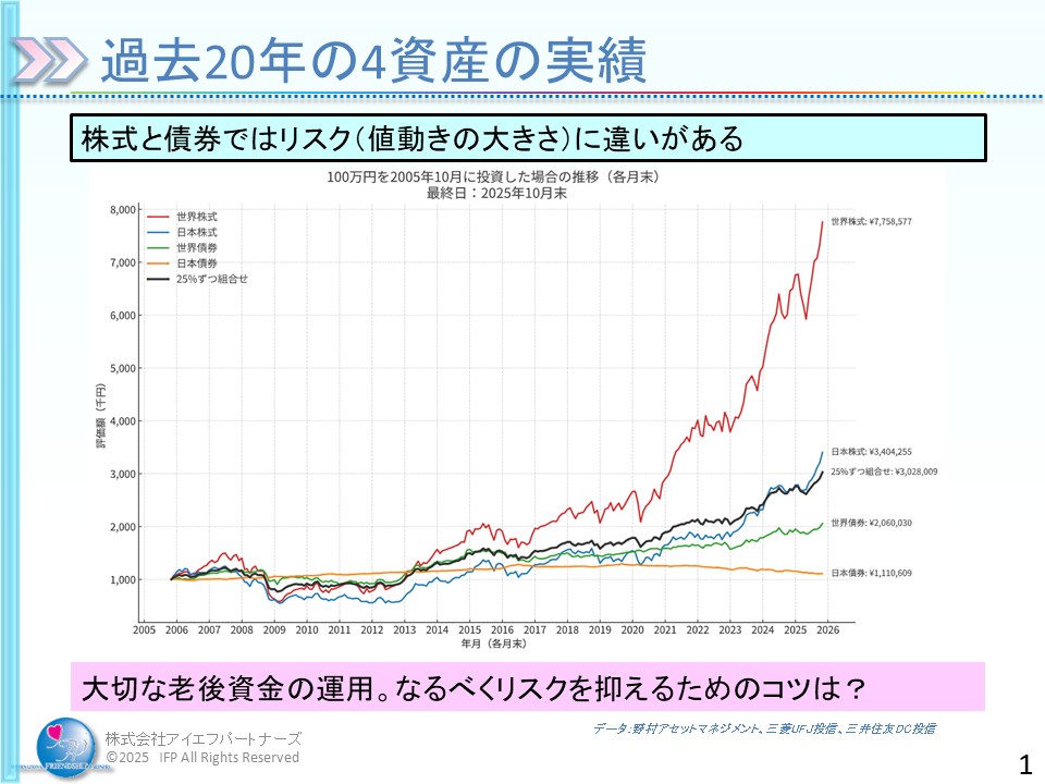 2005年から2025年までの20年間の4資産の成績のグラフをご覧ください。
