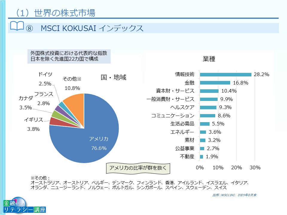 まずは、2025年10月末現在のMSCI KOKUSAIインデックスの構成と業種分散を確認しましょう。