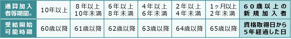 確定拠出年金の受取りは原則60歳からですが、60歳到達時に加入者等期間が10年未満の場合、受取り開始が遅くなります。