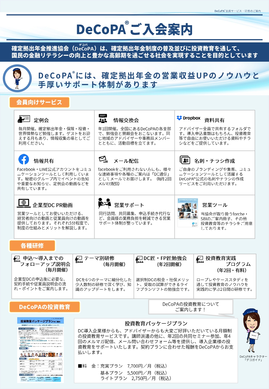 | 内容 | ① 確定拠出年金の仕組みと協会が扱うプランの特徴 ② アドバイザー業務について ③ アドバイザーの収入とメリット、費用 ④ 協会サービスについて |